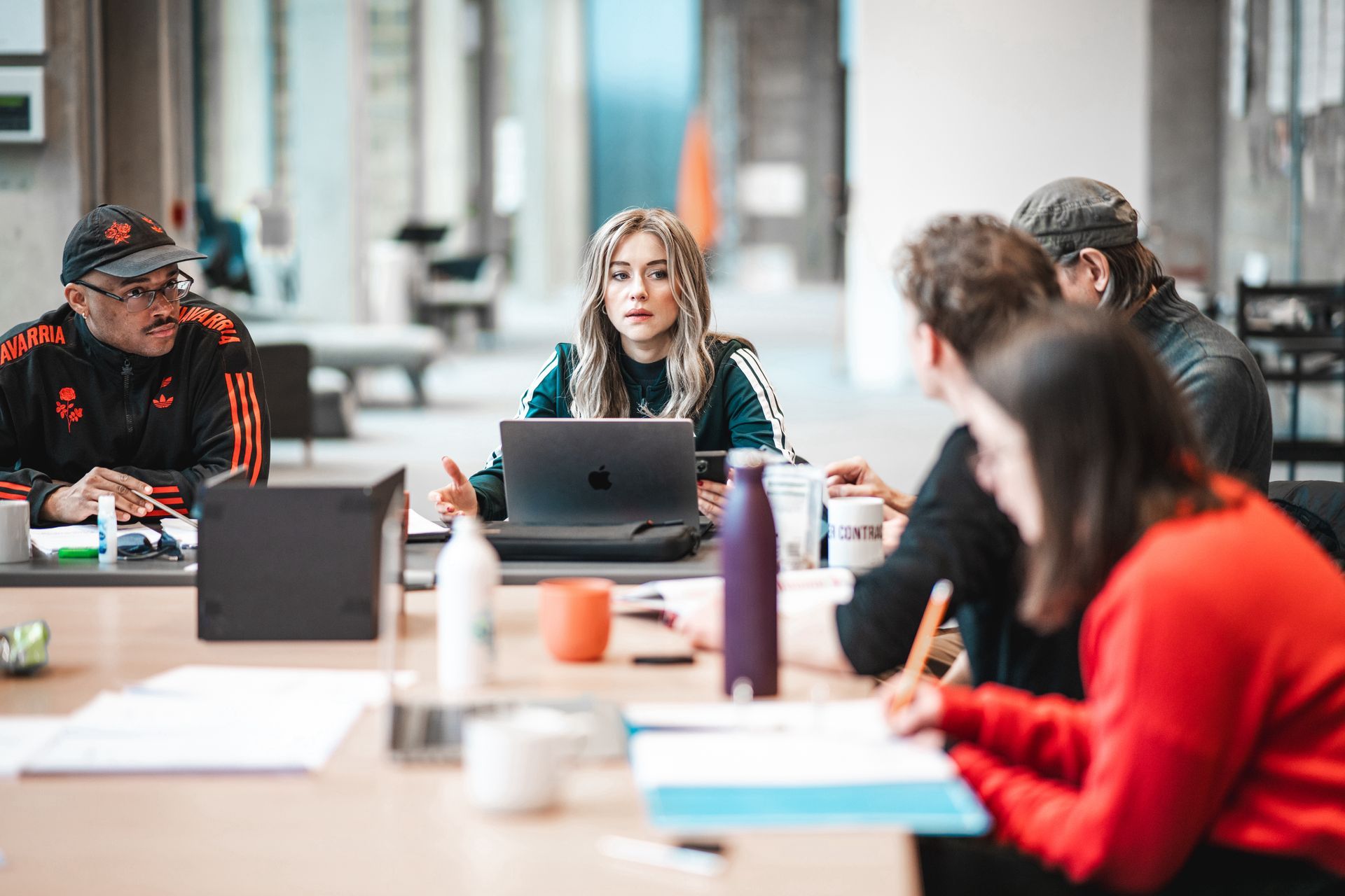 Image above: Table read of the play with Anthony Simpson-Pike (left) and Olga Braga (centre)