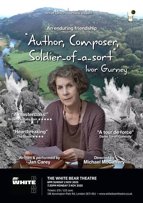 A celebration of the enduring friendship between the brilliant and tragic composer and World War I poet, Ivor Gurney, and Marion Scott, writer and trailblazer of women musicians, written and performed by Jan Carey. It was to Scott that Gurney sent his music and poetry from the trenches. The horror of The Great War, contrasted with his deep love for his native Gloucester, coloured his writings. Yet Gurney's slow deterioration into madness after being gassed at Passchendaele showed that, despite their very different backgrounds, their friendship withstood war, illness and despair, as well as triumph, madness and joy.
