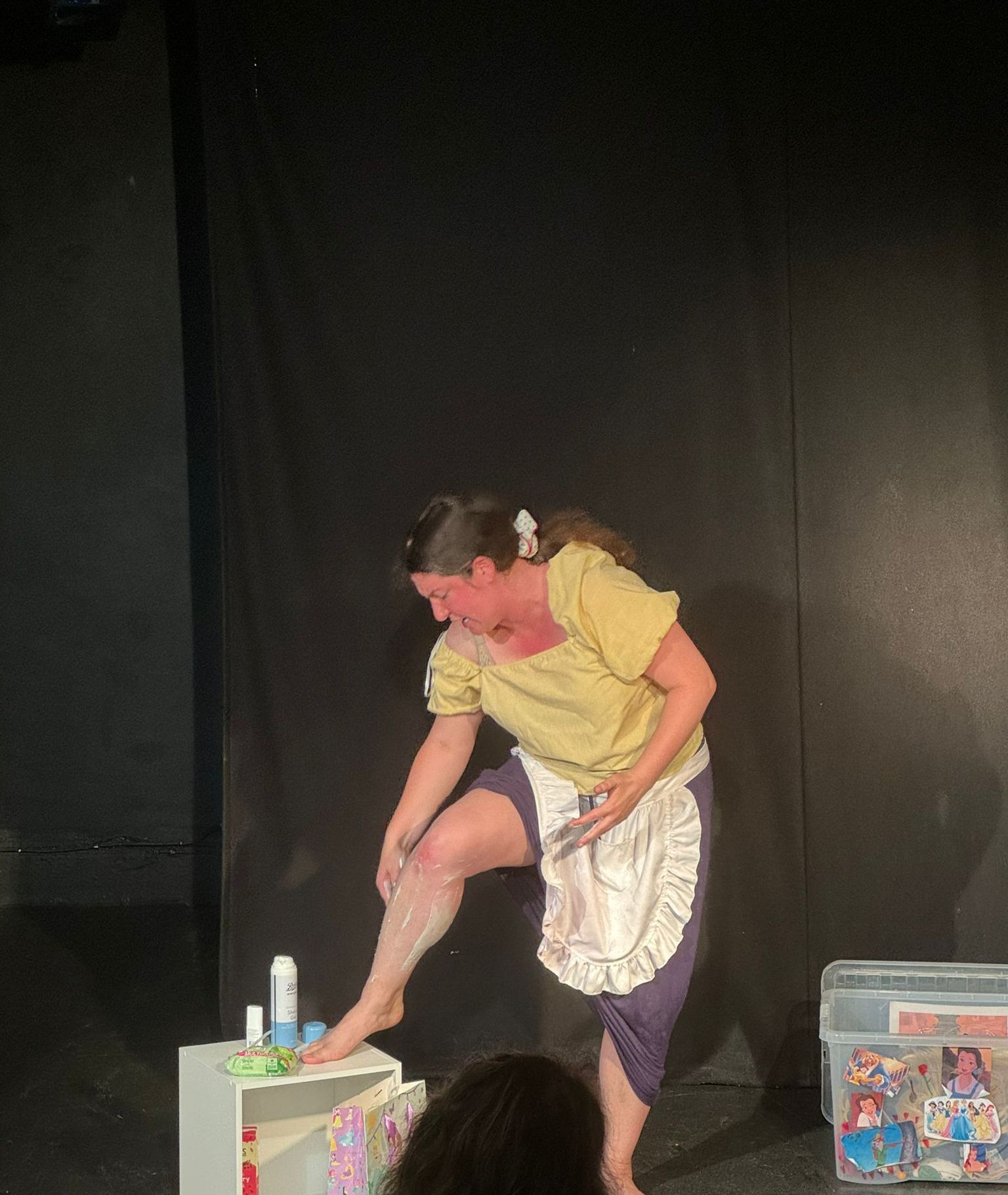 Dramaturgically, the show is well-considered. As the audience enters, they are invited to play children’s games like MASH and fortune teller, only to be cursed with ugliness by a witch. Cahn decodes the concept of beauty through Beauty and the Beast, masquerading as Belle and interacting with characters like Lumière (a sock puppet with a moustache), Mrs Potts (who catches her masturbating), Plumette (who teaches her how to wear makeup) and Gaston (an artful sharpie smile on Cahn’s bicep). The set consists only of storage boxes filled with Disney princess paraphernalia alongside coming-of-age teen essentials; a particular favourite of mine was a magazine titled ‘Happy Endings’ boasting a big-breasted Cinderella on its cover.