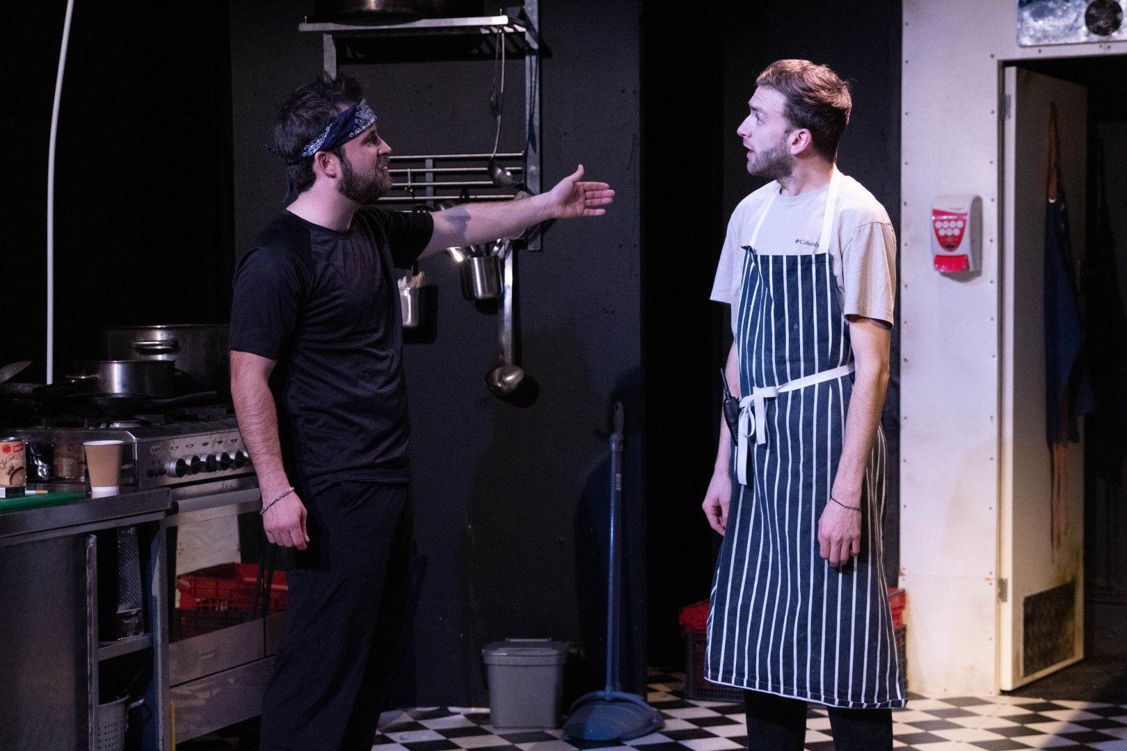 This two hander was inspired by the creators running a cramped catering caravan on a busy film set and it’s terrific fun. Half the stage (right) comprises a realistic catering kitchen in a capsule so that the actors can run in and out of it, take orders and use the “outside” space which is the rest of the stage. Designers Alfie Frost and Tash Tudor have done a good job with this.