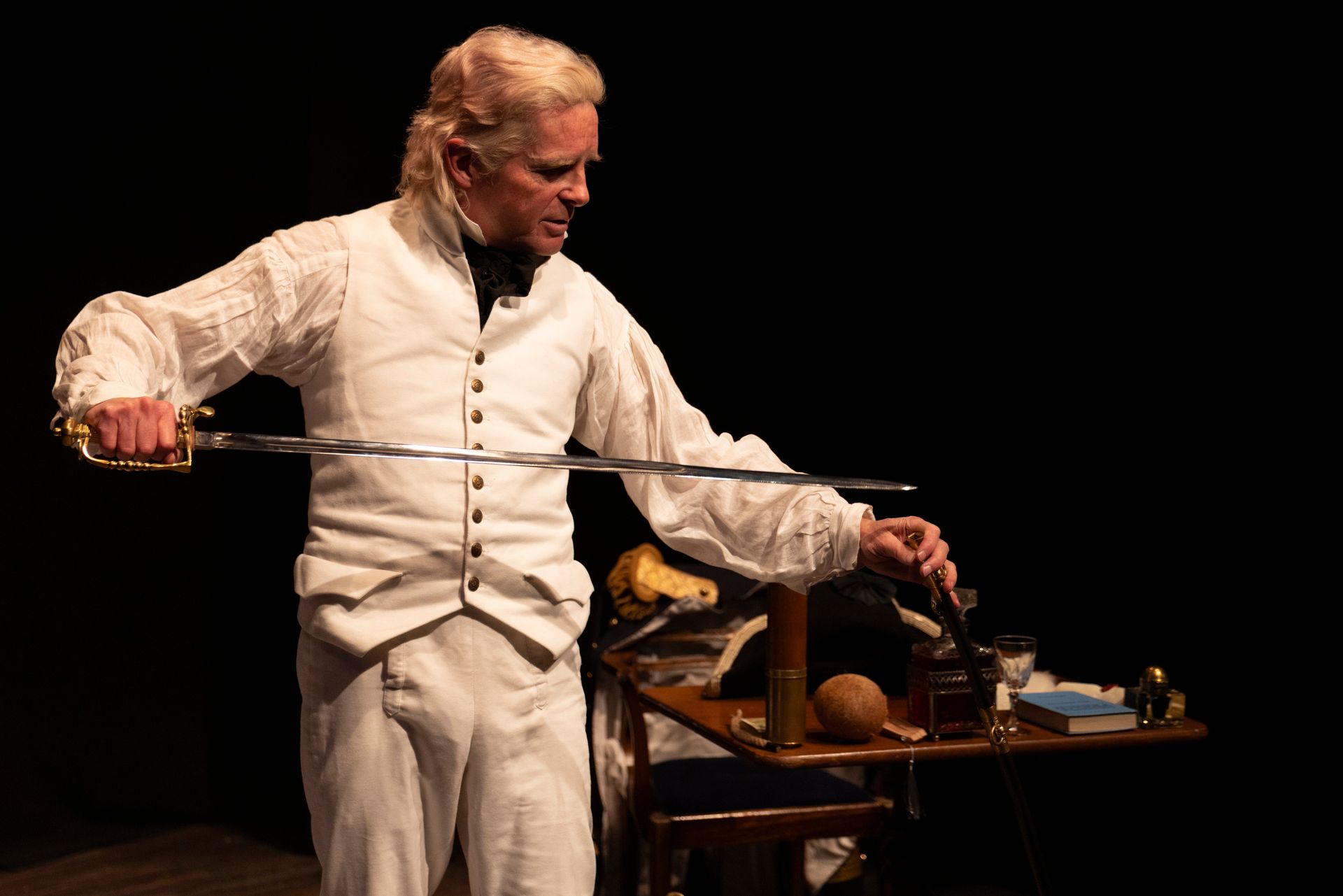 We are clearly in safe hands as Preston’s academic research, journalism and screen work, makes him the right voice to bring Nelson to life. In fact, Nelson is nothing but a miserable, needy, “middle child” forcing himself as a child into the family spotlight, in his early years. Preston makes for a versatile actor, hopping and jumping across the stage with sword at the ready, even taking a suspicious swig of a liquid that looks like actual brandy on stage.