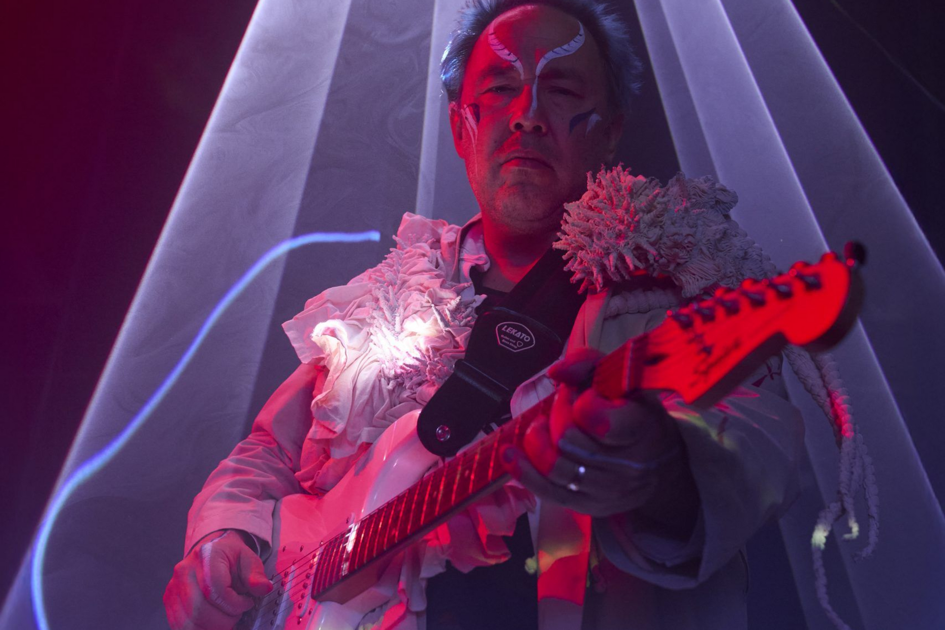 The Beijing Opera vocal, of singer-performer He Song Yuan wearing a dazzling attire, also playing on the percussion and guqin, was simply majestic. Performances from live musicians Daniel York Loh (guitar and harmonica) and Chen Yu Xiao (xun/xiao, Chinese flutes) were transcendental and mystical, with politically charged spoken word lyrics of York Loh rising from the depth.