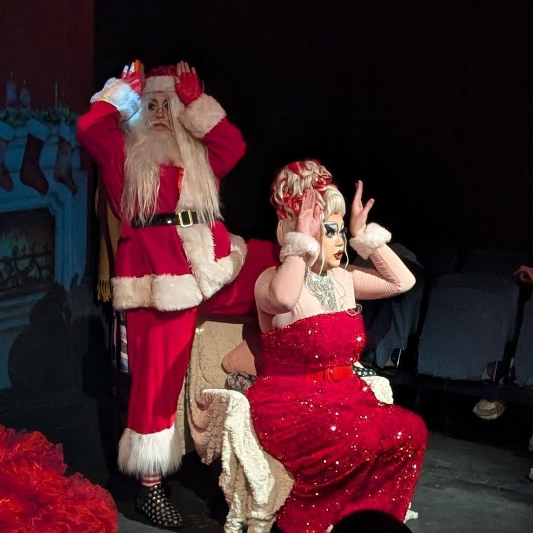 Thatalie Girl gives us a diminutive Mr Christmas, clad in all the usual gear including a long white wig which she rather summarily tosses back over her shoulders every few seconds. Brent Would is a tall, glitteringly attractive Mrs Christmas in a startlingly curvy red trouser suit. It is Christmas Eve and they are welcoming the audience as guests to whom they sing, and with whom they play games. And, effectively, that’s the plot although there are references to their rather on-off recent history together. These actors work seamlessly together with a lot of very slick quickfire response,