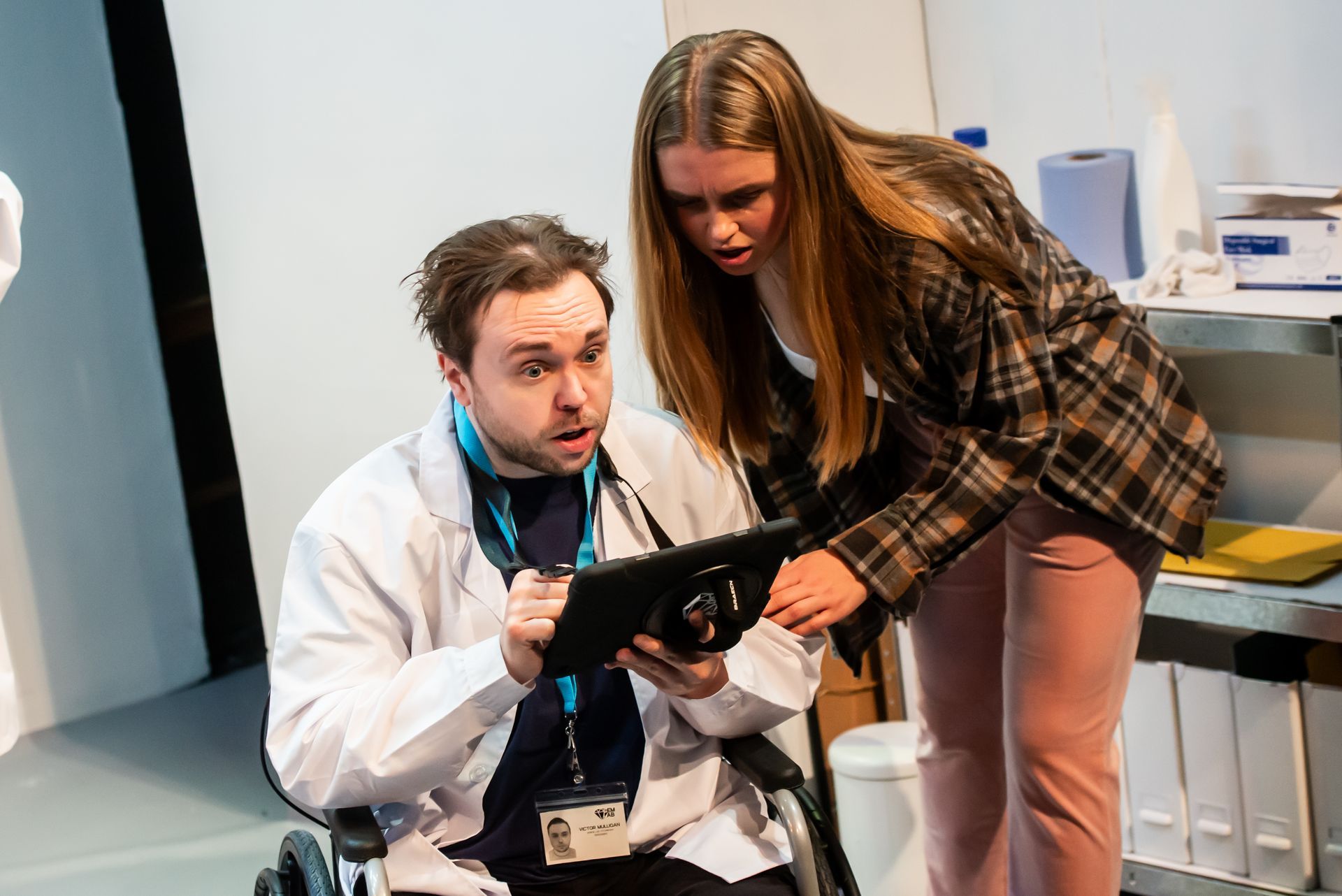 Tech and stage design complemented each other to considerable effect. With simple lighting cues and location changes, danger presents itself and the pace is picked up, as the plot unravels to its bizarre conclusion. Not to mention, that The Tabard’s familiar black is replaced by jarring white panels that immediately set the scene for a science lab.
