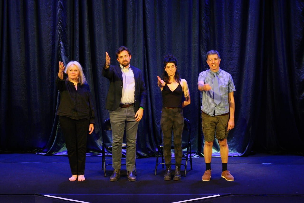 Sarah (also played by Zadow) is quickly thrust into the nightmare reality of having a deepfake sex tape circulate online. Yet instead of digging into what such a violation might do to a person – how they might react, unravel, or fight back – the play continually expands outward. Each scene introduces a new issue or character, without staying with any thread long enough to watch Sarah respond with meaningful action. She visits a police station and is met with a credibility-stretching level of apathy. A skeleton from her past appears in the form of Taz. Her partner’s parents withdraw their offer to help with a house deposit. Her partner then confesses that he finds the video “kinky.” In short, a lot of spaghetti is thrown at the wall. Some of it sticks, but it doesn’t form a cohesive whole. Throughout, characters insist on making bizarre choices that are hard to justify and often seem to undermine things they said or did moments before. I suspect that part of the issue lies in Sarah’s fundamentally unresponsive nature. Watching her watch her life implode is less compelling than seeing her actively attempt to reclaim control. I wanted her to do more.