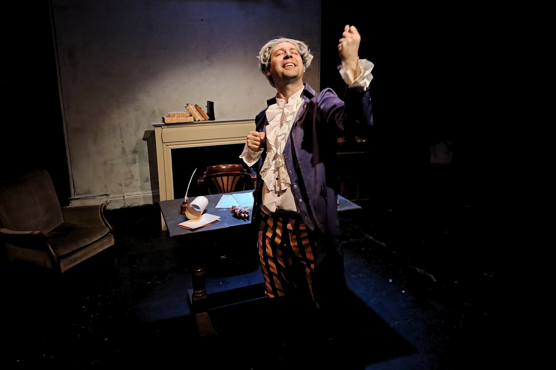 He might be a fraud, freak and a victim of his father’s shadow but if Willliam Ireland is to die, he will perish whilst writing. Production Company Stage D’Or reinvents a little-known historical event in literary history into a script spinning with whimsical flair and wit. We cringe at William’s self-obsession, watch his occasional puppetry of other characters with a smile and roll our eyes at the pretentiousness so common to the 18th century period.