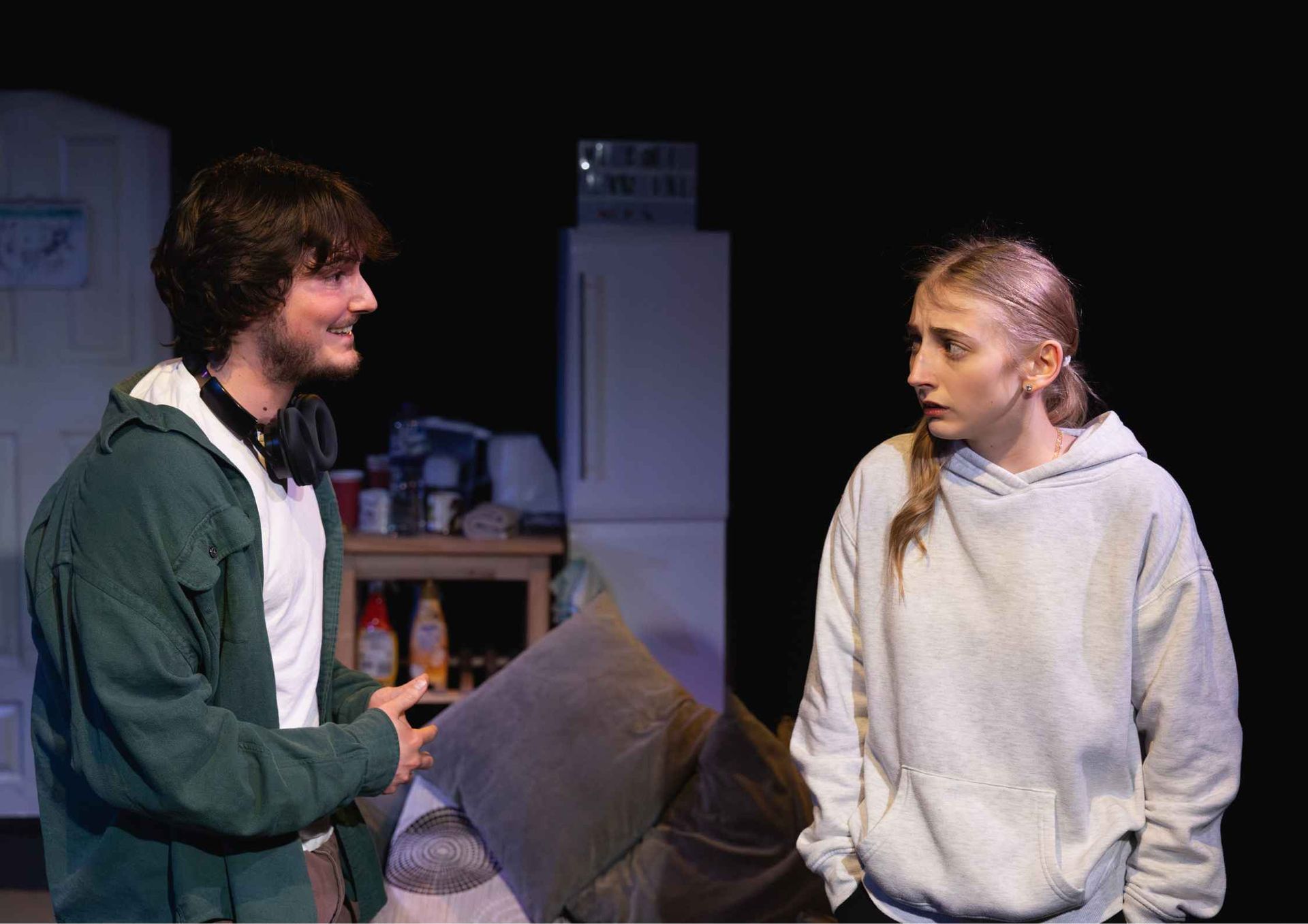 Despite the shared circumstances of their characters, Ryder and Husband have written five distinct young adults who are fully-realised while evading stereotypes. Charlotte, played by Katie Emanuel, could have easily fallen into the trope of the repressed Catholic school girl. Instead, she is three-dimensional and relatable, both because of and in spite of her ingrained, misguided moral superiority. Emanuel impressively captures each phase of Charlotte’s emotional arc. Bex, played by Emily Dilworth, provides a foil to Charlotte’s version of femininity. Bex rejects sanctimony and finds liberation in sexuality and nightlife. Dilworth embraces Bex’s unapologetic spirit, along with her vulnerability. Kane, played by Ollie J Edwards, is the most opaque member of the flat. This opaqueness is intentional - we are introduced to Kane as the final, most unassuming flatmate. Over time, however, his character comes increasingly into focus and by the end of the play we understand Kane as the true master of the lost art. Edwards expertly delivers the play’s central and most disturbing monologue.