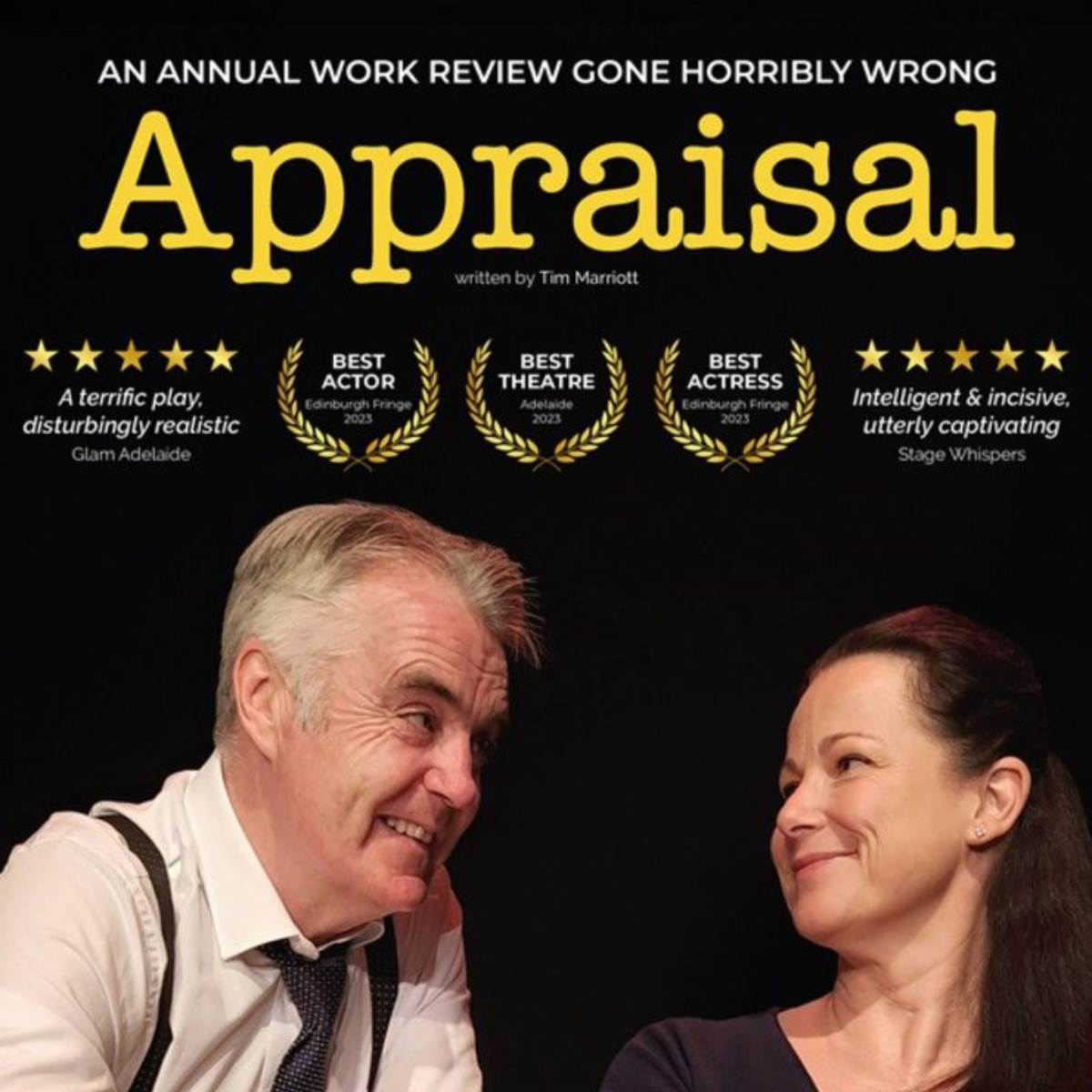 A two-hander dark comedy, Appraisal is a power play of manipulation, subtext and subterfuge, exploring the explosive consequences that can arise out of a seemingly innocent conversation. It achieved 5* reviews and Sold Out performances at Edinburgh Festival and Adelaide Fringe, where it also won a Best Theatre Award. The 2023 Edinburgh run garnered multiple award nominations from OffFest and Dark Chat including Best Play, Best Director, Best Show, and winning Best Actor and Best Actress.